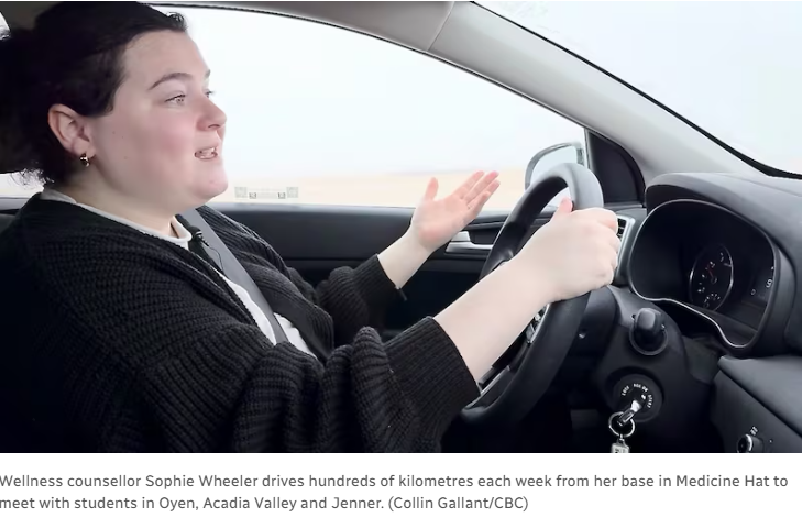 It's 7:30 in the morning as she pulls out of Medicine Hat toward Oyen, a 190-kilometre drive she makes three times a week, part of a new attempt to bring support to some of Alberta’s most remote schools.
