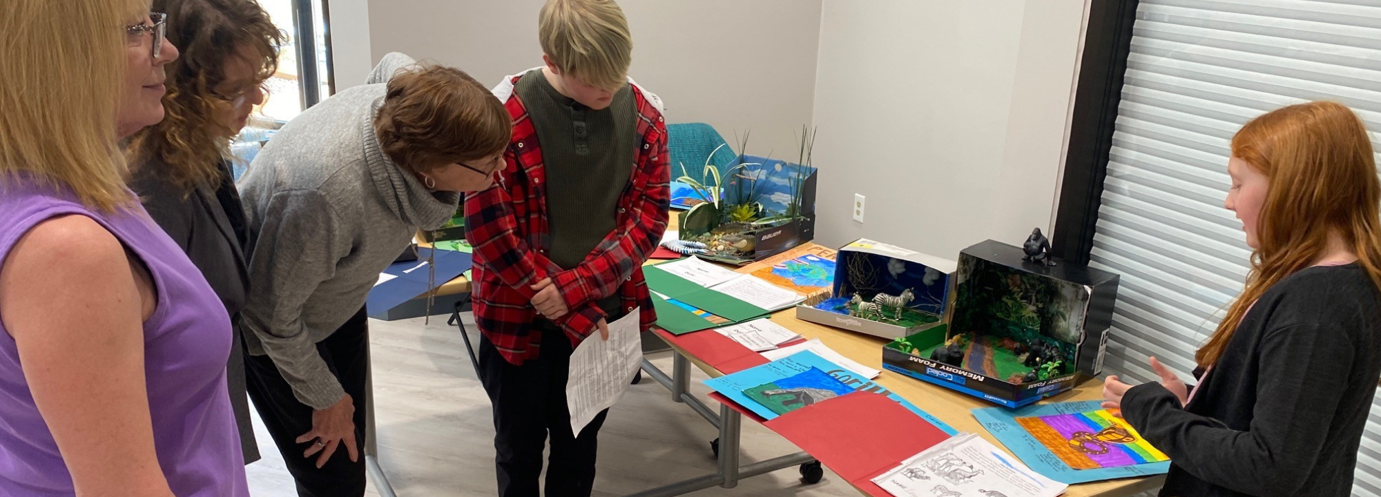 Above: PRPS trustees Lois Bedwell, Patty Rooks and Pam Cursons listen while Margaret Wooding students Conner Che and Lilly Green explain the different aspects of the school's exhibition of learning project focused around the book One and Only Ivan.